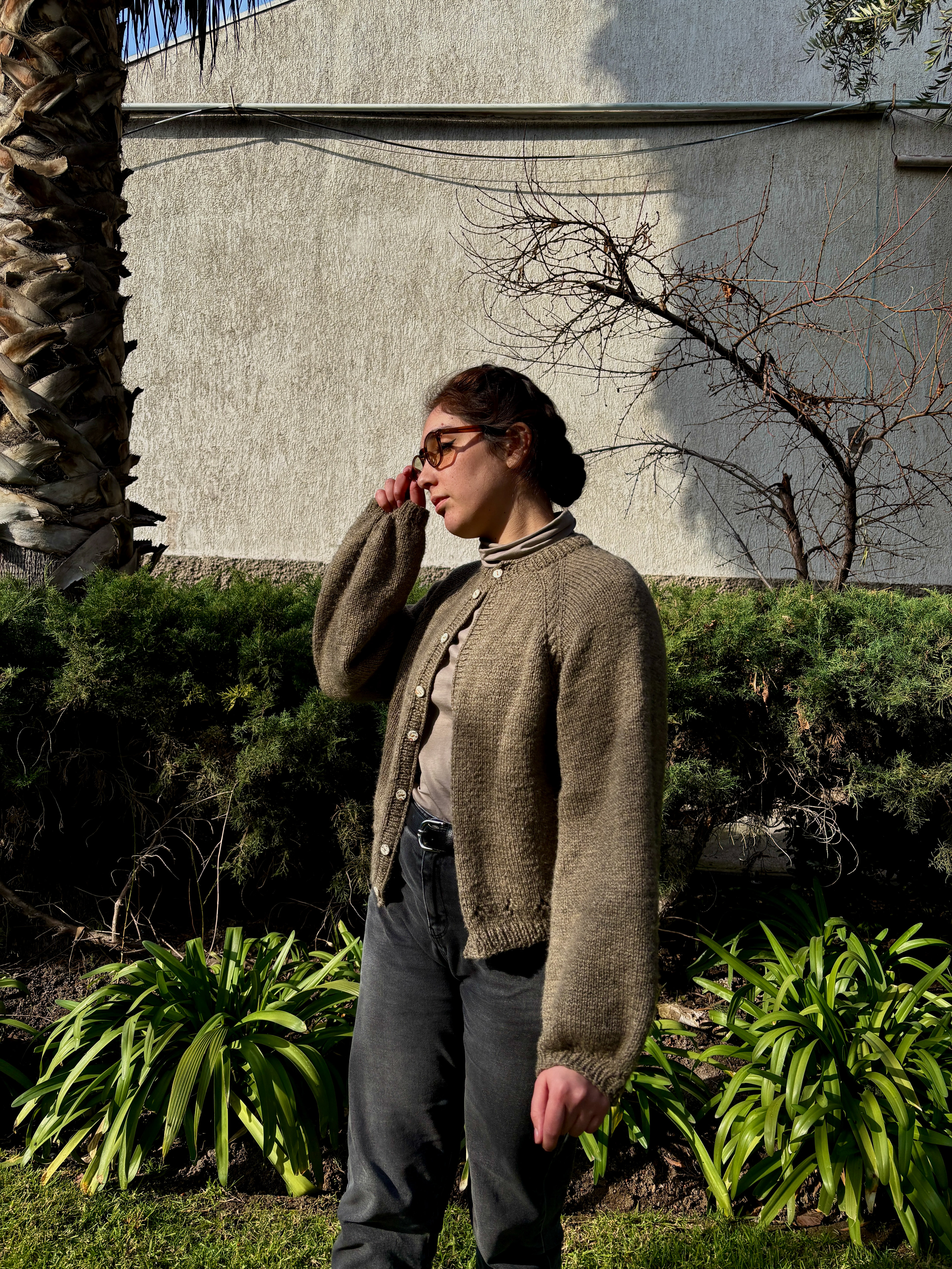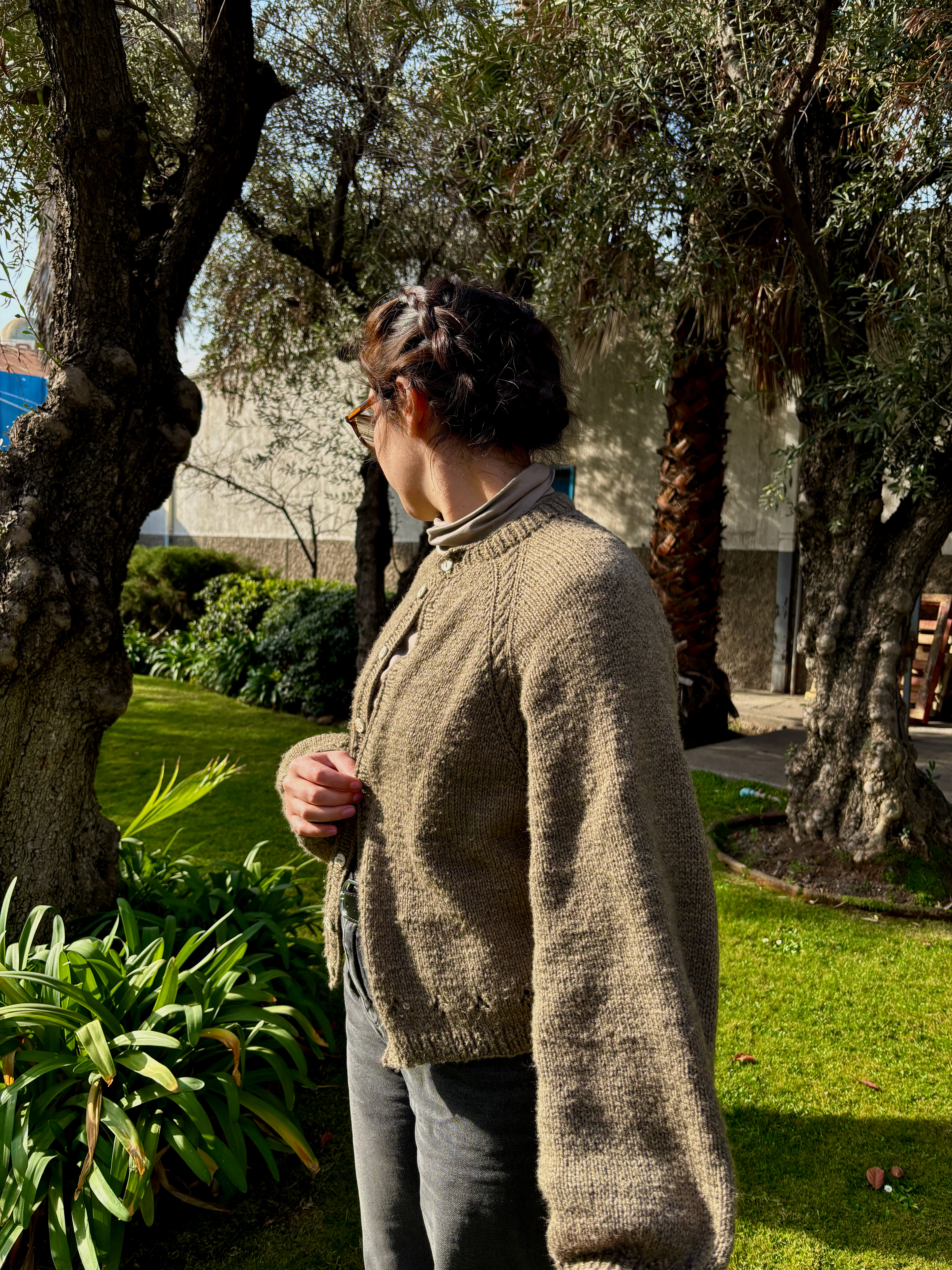 Ideal para acurrucarse en casa con un libro entre manos o para salir a explorar con una capa de suavidad envolvente. Se teje en una sola pieza, de arriba hacia abajo, utilizando aumentos raglán para formar los hombros. El canesú se adorna con elegantes trenzas que evocan ramas entrelazadas, mientras que los detalles calados cerca del borde aportan un acabado ligero y etéreo. Una hilera de botones completa esta prenda versátil y encantadora, perfecta para llevar abierta o cerrada.